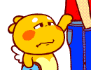 A cute yellow cartoon dragon with small wings looks distressed, indicating an urgent need to go to the bathroom.