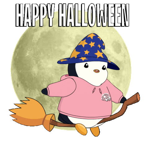 A cute penguin in a witch hat and pink hoodie flies on a broomstick with a full moon background, wishing 'Happy Halloween'.