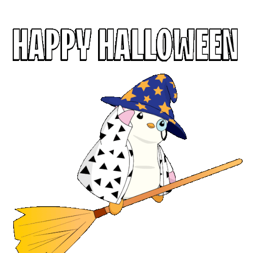 A cute penguin character dressed as a wizard flies on a broomstick, wishing everyone a Happy Halloween.