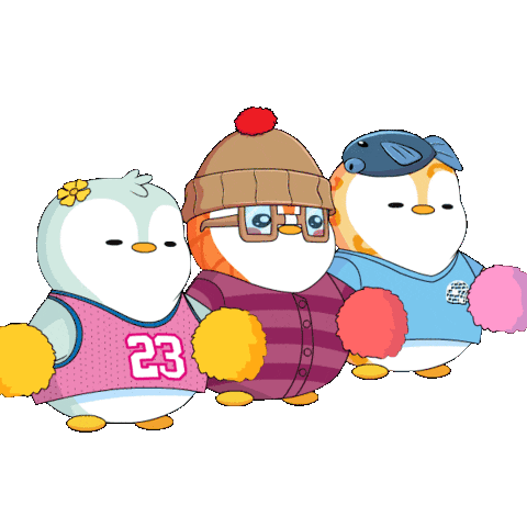 Three adorable kawaii penguins, dressed as cheerleaders with pom-poms, enthusiastically cheer and dance.
