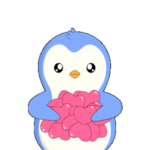 Adorable kawaii penguin wiggles happily, surrounded by pink hearts, with 'HAPPY' text above its head.