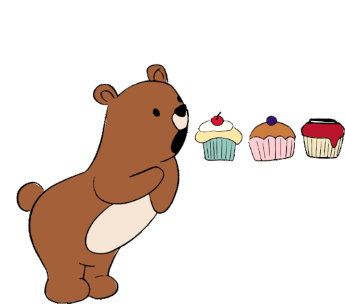 A cute Keababies bear looks shocked as cupcakes disappear, leaving only one. Its mouth is wide open in surprise.