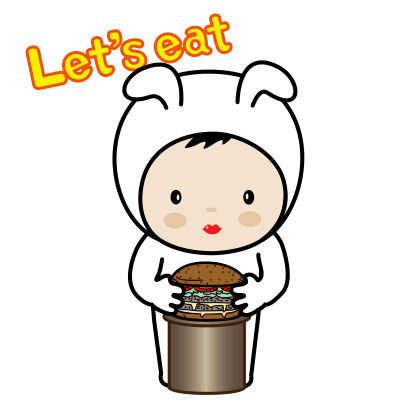 Adorable animated sticker of a baby in a white rabbit costume holding a giant hamburger, with 'Let's eat' text.
