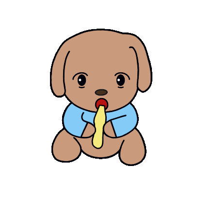 A cute brown puppy character, wearing a blue shirt, happily sits and eats a yellow sweet treat or dessert.