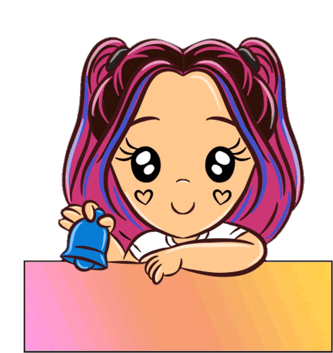 A cute animated girl with pink and blue hair rings a blue bell, winks, and shows a '!NOTIF' banner with a heart.
