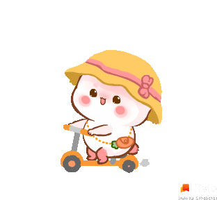 A cheerful peach-like character in a sun hat happily rides a small orange scooter, enjoying a stroll.