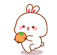A charming white bunny-like character with an orange outline walks while holding a small, smiling cookie.