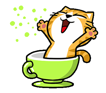 A joyful cartoon cat with orange stripes laughs happily while sitting in a bright green cup, paws raised.