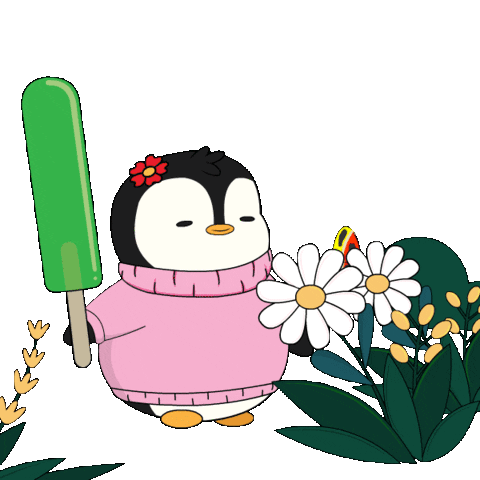 A cute penguin in a pink sweater holds a green popsicle and daisies, enjoying a sunny summer day with a butterfly.
