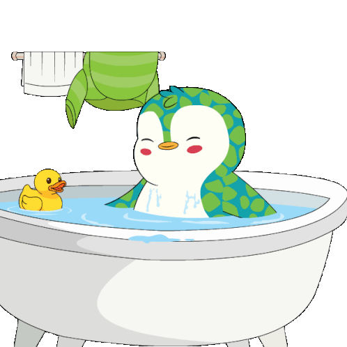 A cute, pudgy penguin enjoys a relaxing bath with a rubber ducky, splashing happily in the tub.