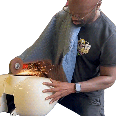 Rich Benoit uses an angle grinder to cut a large object, creating a shower of bright sparks. He wears a Wario t-shirt.