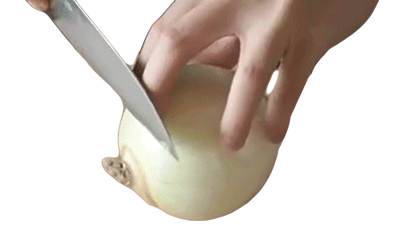 A hand expertly cuts and peels a white onion with a knife, demonstrating a cooking technique from Two Plaid Aprons.