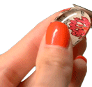 A hand with red nail polish uses scissors to cut a piece of fabric with a floral pattern, showcasing a crafting activity.