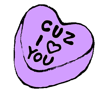 A rotating purple heart candy with "Cuz I <3 You" text, perfect for romantic messages and Valentine's Day, associated with Lizzo.