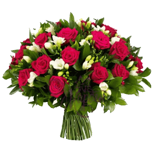 a bouquet of red roses and white flowers with green leaves
