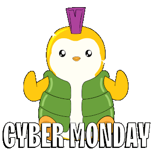 A cute Pudgy Penguin celebrates Cyber Monday, holding shopping icons like a t-shirt, shoes, and a shopping cart, ready for deals.