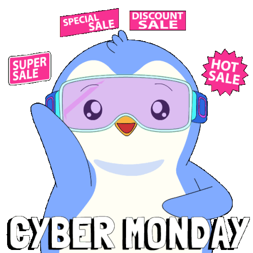 a penguin wearing goggles surrounded by stickers that say cyber monday