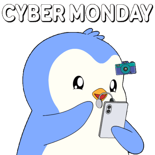 a penguin with a guitar in its eye is looking at a cell phone with the words cyber monday written below it