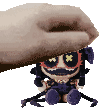 A hand holds a plush toy of Cyn from Murder Drones, featuring her signature mustache and sunglasses.