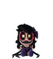 Cyn from Murder Drones, a plush toy with black hair and red X-eyes, sits with a stitched smile.