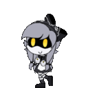 Cyn from Murder Drones, a grey-haired character with yellow eyes and a black mask, walking animatedly.