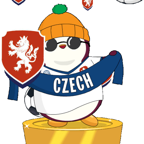 Cute penguin in an orange hat and sunglasses, holding a 'CZECH' scarf, celebrating football with lion crests.