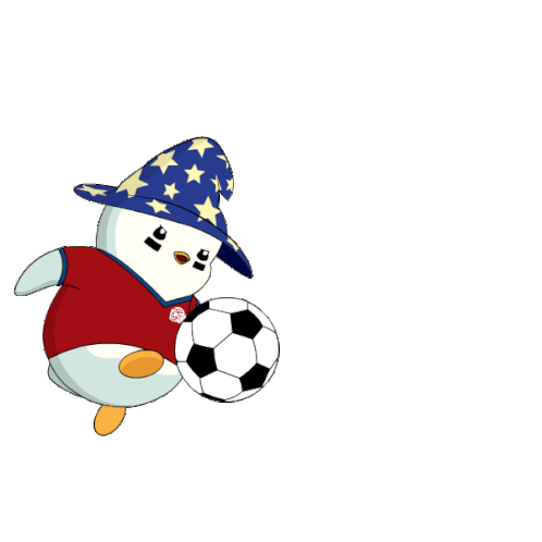 a penguin wearing a wizard hat is kicking a soccer ball in a cartoon