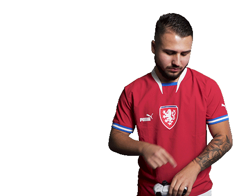 Mariooso Hrdílvi, a Czech soccer player, points to his arm and then beckons, holding a PlayStation controller.