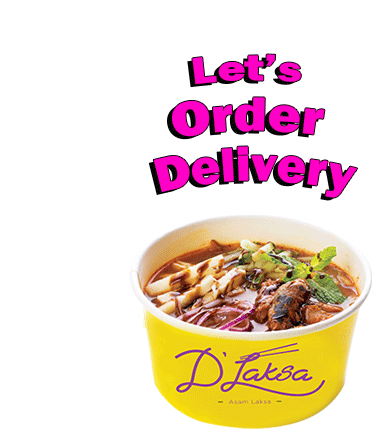 A vibrant animated sticker featuring a delicious bowl of D'Laksa Asam Laksa, encouraging viewers to order delivery.