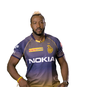 Cricketer Andre Russell dabbing in his KKR jersey, celebrating a moment during a VIVOIPL match.