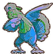 A cartoon turkey character, Dabkey, performs a dab dance move with its colors shifting from purple to blue to green.