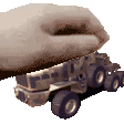 A hand holds a toy truck carrying a large rock, referencing the Dachshund Offtheroad game. Features a detailed truck and terrain.