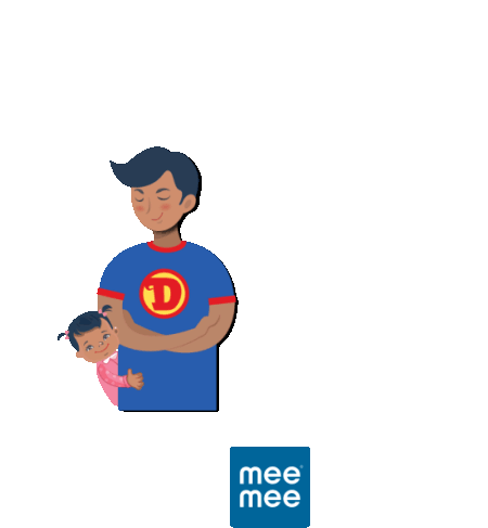 A loving superhero dad embraces his baby daughter, celebrating their special bond with the text 'Daddy's Girl' and Mee Mee logo.