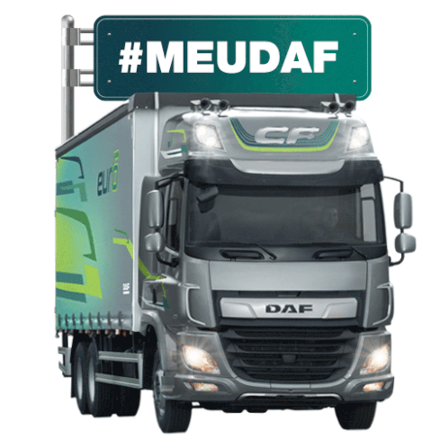 A grey DAF truck with a green sign displaying the hashtag #MEUDAF, featuring "euro" branding on its trailer.