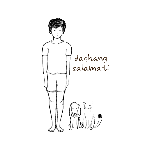 Animated sketch of a smiling person with a dog and cat, expressing 'Daghang Salamat' (Thank you very much) from Guache Cookies.