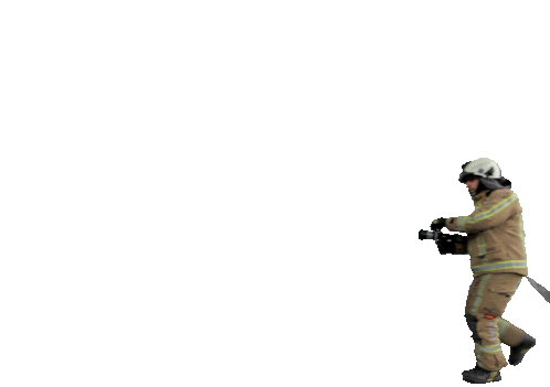 A firefighter in full gear kneels and sprays a powerful stream of water from a hose, celebrating Dag van de Brandweer.