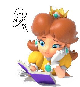 Princess Daisy looks thoughtful and confused while reading a book, with animated scribbles above her head.
