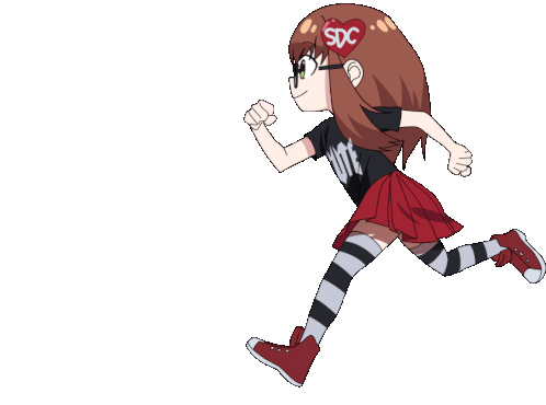 Dakooters, an anime girl with red hair and glasses, runs with a smile, wearing a black shirt and red skirt.