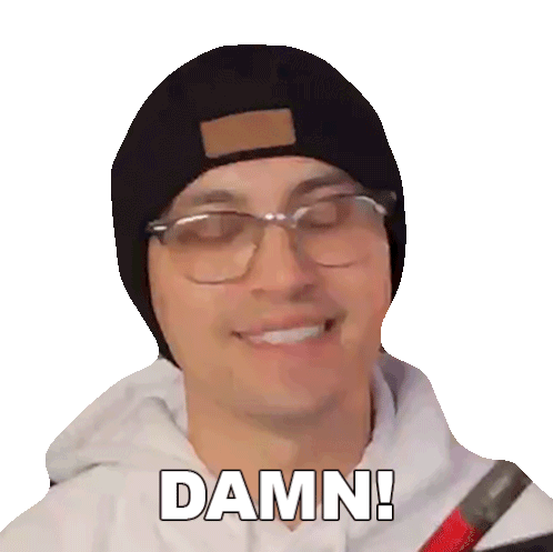 Hunter Engel, wearing a beanie and glasses, smiles and exclaims 'DAMN!' in this expressive animated sticker.