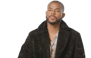 Trevor Jackson in a fur coat shrugging with a dismissive or regretful expression, conveying 'missed that' or 'no'.