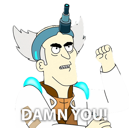Barry Barris from Farzar angrily exclaims 'Damn You!' with a raised fist, then comically puckers his lips.
