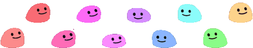 Cute, colorful blob characters with smiley faces wiggle and dance on a white background, spreading joy.