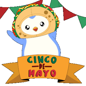 A cute penguin character wearing a festive taco hat and holding a 'Cinco de Mayo' banner, ready to celebrate.