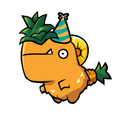 A cheerful pineapple character, Frutti Dino, joyfully dancing and jumping with a happy, fun vibe.