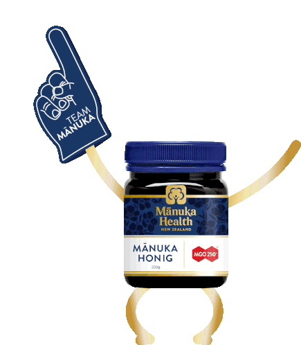 A lively Manuka honey jar with arms and legs, enthusiastically dancing while wearing a 'TEAM MĀNUKA' foam finger.