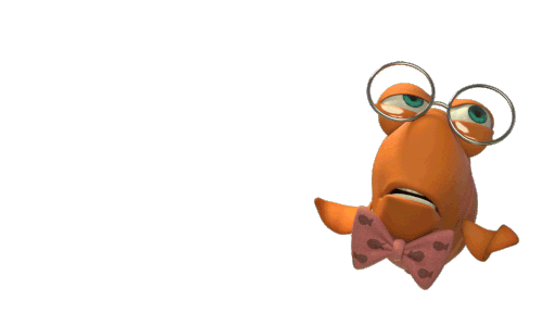 An animated orange fish character wearing glasses and a pink bowtie dances and sings with a cheerful expression.