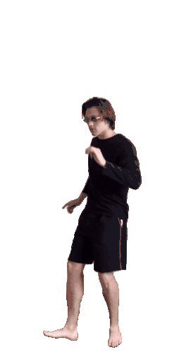 a man in a black shirt and black shorts is standing on one leg