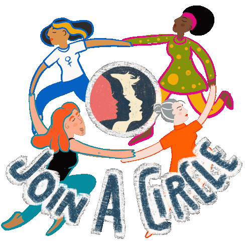 Diverse women dancing in a circle, holding hands, with the message "JOIN A CIRCLE" for unity and empowerment.