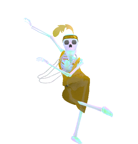 A vibrant skeleton in a yellow dress with a feathered headband and beads dances with a retro 60s vibe.