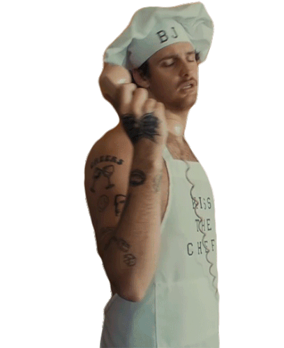 Babyjake, shirtless and wearing a chef hat, dances and vibes while holding a wooden object to his mouth.